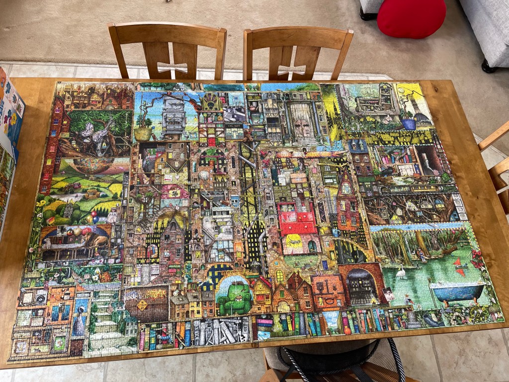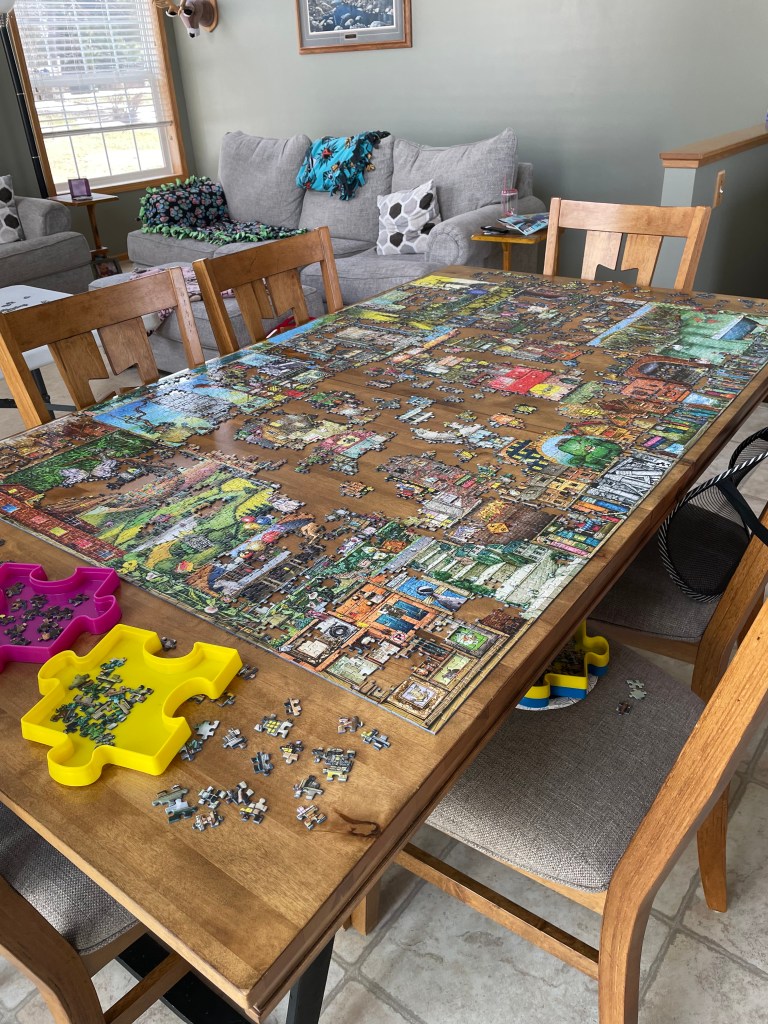 Fast forward to 2026 and I am staring at a mound of puzzle pieces. “This is going to take a while,” I thought. So, I began finding the edge pieces first. I had to put up 2 long tables to house all the pieces. I even had friends come over to help. While they did a great job getting it started, not much progress was made; so many pieces were left lying around. “Hmmm, how long will I let this take over my dining area before I call it quits?”